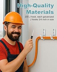 Ample Quantity for Large Projects - The pack includes 200 J hook, each galvanized j hooks 3/4 inch in size, The 3/4 inch size is ideal for managing different types of cables, whether you're working in a home office or a larger commercial space High-Quality Materials - Crafted from G60 galvanized steel, these cable support j hook offer excellent rust resistance and are built to endure wear and tear. ensuring secure and reliable cable management for long-term use in both home and commercial settings Efficient Cable Organization - 3/4 inch compact J-shaped hook designed for narrow spaces, These metal j hooks cable support 3/4 inch j hook hangers are a great solution for reducing wire clutter and keeping your cables neatly organized and easily accessible Quick and Easy Installation - Installing thesej hooks for cable management is quick and hassle-free. Simply drill a hole in the desired surface, insert the anchor bolt, and screw the hook into place. These wall mounted cable j hook are compatible with wood, drywall, and concrete surfaces, allowing for easy installation across a wide range of environments Wide Application for Various Cable Types - These cable hooks are designed to accommodate a wide range of cable types, including network cables, electrical wires, CAT5e, CAT6, CAT7, and fiber optic cables.Whether you’re managing cables in your home, office, or a commercial space, provide a versatile cable management solution