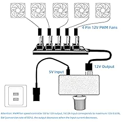 - This fan speed controller is compatible with DIY cooling devices such as 12V four wire fans, water pumps, and small hosts. It is equipped with a 4-pin 5-way hub and can drive multiple fans simultaneously.Supports 4-pin 12V PWM speed regulation, with knob control for 0% -100% speed. Powered by USB,built in boost circuit, 5V to 12V, stable performance. The packaging includes a controller, USB-C cable, and hub.