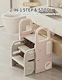 - The UNICOO 2-in-1 Toddler Step Stool is the perfect companion for growing kids, offering versatility and convenience. This toddler step stool foldable feature allow it to transform effortlessly from a dual-step platform to a triple-step climbing mode, adapting to your child’s needs as they grow. Ideal as a potty training stool, it helps toddlers gain confidence while learning independence in daily tasks like handwashing, reaching sinks, or assisting in the kitchen. With the unique push-and-store design, it can be compactly stored at just 10.9 inches, making it a space-saving solution for any home. Safety is a priority with its anti-slip steps and sturdy construction, ensuring secure footing for every use. This step stool for toddlers is lightweight, portable, and crafted with durable materials for long-lasting use. Whether used as a step stool foldable toddler for potty training, or a collapsible toddler step stool for reaching high places, this versatile toddler folding step stool combines functionality and practicality in a sleek, compact design.