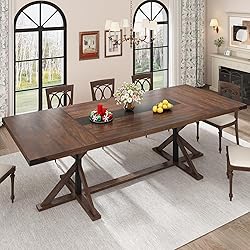 Classic Farmhouse Design: This large rectangular kitchen table features delicate lines and a simple yet stylish design. The tabletop utilizes a brown and black color block design, replacing the need for a runner. Whether you prefer a farmhouse look, modern aesthetics, or other unique styles, this natural wood-grain dining table can complement a variety of decorative themes. Sturdy Structure: The legs of this farmhouse dining table are crafted in a robust "X" and "K" shape. With thick high 29.9IN wooden legs combined with a 80mm metal support column in the center, this dining table ensures excellent stability and load-bearing strength, supporting up to 330 pounds. The adjustable feet at the bottom ensure proper use on uneven floors. Accommodates 6 7 8 9 10 People: With a spacious tabletop measuring 94.5 X 39.4 inches, this large dining table offers ample space to accommodate 6, 7,8,9,10 people for dining or gatherings. The roomy tabletop also provides enough space to hold vases, plates, glasses, utensils, and decorations, allowing you and your family and friends to enjoy happy moments together. Wooden Dining Table: The thick tabletop and slatted base are made from thick MDF boards and metal rods, providing sufficient support and an elegant modern farmhouse aesthetic, with a weight capacity of up to 330 pounds. Metal protective pieces are added to the four corners of the tabletop to extend the table's lifespan. The thick tabletop features heat-resistant, waterproof, scratch-resistant, and easy-to-clean properties. Versatile and Practical: Measuring 94.5 x 39.4 x 29.9 inches, this sizable table can serve as a practical dining table, kitchen table, study desk, computer desk, or conference table. The dining table comes with all the necessary tools, numbered parts, and clear instructions, with assembly videos available to help you easily put together this wooden dining table.