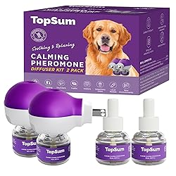 NATURAL CALMING SUPPORT – Our canine pheromone diffuser is formulated with pet-friendly ingredients, offering a drug-free way to help comfort dogs. It mimics natural nursing pheromones to create a comforting environment at home. COVERS UP TO 700 SQUARE FEET – Designed to effectively cover large areas, this diffuser works best when placed in a location where your dog spends the most time. For optimal performance, position it with vents facing upward and keep it unobstructed by furniture, doors, or curtains. PROMOTES CALMNESS:The TopSum Dog Pheromone Diffuser helps ease common signs of discomfort in dogs. It targets triggers like visitors, loud noises, and conflicts between dogs due to environmental changes. This diffuser is specifically designed to create a soothing environment for dogs. VISIBLE RESULTS IN TWO WEEKS – Many pet owners notice a calmer demeanor in their dogs within two weeks of consistent use. Individual results may vary based on the dog's temperament and surroundings. COMPLETE STARTER KIT – This set includes 2 Pack of diffuser head and 2 Pack of 48ml calming vial, providing approximately 60 days of continuous use. For ongoing support, replace the refill monthly for best results.
