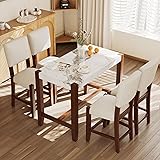 1. Space Saving 4 Chair Dining Table Set: Designed for small spaces, the bar height dining table allows the chairs to be fully tucked underneath, maximizing floor space. This makes it perfect for compact apartments, kitchens, or living rooms. 2. Bar Height Dining Table and Chairs: This mid-century modern furniture set features a stylish faux marble dining table paired with four comfortable linen-upholstered chairs. Its minimalist design and robust construction make it an ideal accent piece for any home. 3. Versatile Use: This 5-piece dining set is not just for meals; it can also function as a desk, workstation, or lounge area, adapting to various living scenarios. 4. Wood Kitchen Chairs Set of 4: Crafted from a durable solid wood frame, this dining set is built to last. The chairs feature soft foam-filled cushions with linen covers for a cozy dining experience. The table can support up to 250 pounds, while each rubberwood upholstered chair holds up to 250 pounds. The tabletop is crafted from MDF with a marble finish, offering excellent stain resistance. A simple wipe with a damp cloth restores its original look. 5. Dimensions & Easy Assembly: Table Size is 47.5"L x 27.9"W x 36.2"H, Dining Chair features 24.6"L x 17.8"W x 40.4"H, Seat Height: 25.5", Partial Assembly is required, All the necessary parts, tools, and instructions are included in the package. Follow the instructions step by step. Also Please NOTE: The Set will come in 2 boxes, they may not be delivered at the same time.