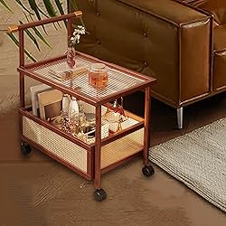 【Versatile Mobile Design】: This side table cart, by traditional Chinese aesthetics, serves as a "mobile castle" for your home. It effortlessly into any corner, adding a unique charm and relaxed to your living space 【Ample Storage Capacity】: Featuring a spacious upper layer and an elevated lower box, this rolling utility cart provides generous storage options. The high clearance allows for easy placement of tall items like bottles and jars, ensuring everything stays secure during movement 【Stylish and Functional】: The elegant imitational woven rattan design not only enhances the aesthetic but also offers protection against dust and collisions. Its breathable structure ensures that it remains fresh while safeguarding your belongings 【Application】: Suitable for narrow space, our storage cart is ideal for use in bathrooms, laundry rooms, kitchens, bedrooms, and offices, and is easy to install 【Multipurpose Organizer Cart】: Multipurpose storage cart is good for storing vegetables, fruits, snacks, and books in your living room or kitchen, with a tabletop for added convenience