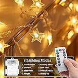【33FT 100 LED Star Fairy String Lights】Powered by 3AAA batteries ( not included ), the star fairy string lights is 33 feet long with 100 bright LEDs. The thin clear wiring and lovey star-shaped LED bulbs will add a delicate and romantic touch to your personal space. Each star has a size of 1.3 inches, creates dreamy ambiance! 【IP65 Waterproof for Indoor/Outdoor Durability】IP65 waterproof copper wires survive splashes, snow, and humidity. IP65 waterproof copper cord wire, do not overheat, high efficiency and energy saving.Indoor outdoor tiny lights for living room, office, kitchen, porch, balcony, patio, gazebo, camper, deck, awning, camping.Enjoy year-round twinkling from Christmas to summer weddings! 【 8 Lighting Modes】There are 8 different modes for the lights, including waves, sequential, slow glow, flashing, slow fade, twinkle, and combination, as well as standard on and off. It can be controlled by the remote or the button on the battery box. Helping us create different atmospheres suitable for Christmas trees, play tents, girls‘ bedrooms, wedding parties,gardens, etc. 【Smart Timer】The timer function allows us to set the timer function to 6hrs on/18hrs off. LED beads are energy-saving and efficient, keeps long lasting and providing consistent high brightness.Our cute star-shaped lights are made of high quality , which is strong, yet emits a soft light. The cord is transparent, which complements the crystal star. 【 Wide Decorative Uses 】Transform spaces in seconds: create star curtain lights for windows, romantic wedding arches, or cozy bedroom accents. Perfect for indoor and outdoor parties,kids' rooms, tents, living rooms, nurseries, cubicles, loft beds, ceilings, backyards, patios, porches, balconies, corridors, fences, staircases, awnings, bulletin boards, shows, bistros, pubs, cafes, hotels, flower shops, restaurants, malls, commercial buildings, shopping centers, festival, holiday, Christmas.