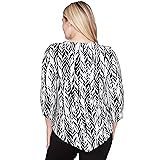 • This puff print abstract feathers top features a striking feather design with a unique texture, adding depth and movement to the look. The crewneck, three-quarter sleeves, and V-shaped hemline create a flattering silhouette.