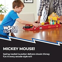 - Bring the fun of the bowling alley straight to your table with the World Tech Toys Mickey Mouse Tabletop Bowling Game—a magical mix of Disney charm and arcade-style action that kids and adults will love. Designed with bold Mickey Mouse graphics and retro-inspired visuals, this mini bowling game delivers fast-paced excitement while sparking the imagination of any young Disney fan. With a spring-powered launcher and three included balls, players can aim, shoot, and knock down six cheerful pins in a game of skill, coordination, and pure fun. No need to reset the pins by hand, our tabletop game features automatic resetting pins that pop right back up after every roll, keeping the momentum going and the competition fierce. Perfect for solo practice or turn-based games with friends and family, it’s a great boredom-buster for rainy days, parties, or office breaks. Compact and lightweight, it’s easy to pack and play anywhere, from dorm rooms to coffee tables to classroom desks. Built for fun and designed for portability, it is one of the best table games for fans of Disney and bowling fanatics. Ideal for kids ages 6 and up, it’s a standout pick for birthdays, holidays, white elephant gifts, or everyday play that keeps the good times rolling. Whether you’re shopping for a Toy Story collector or a young bowler in training, this Mickey Mouse game is sure to strike a smile!