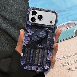 TnXee Case Compatible with iPhone 17 Pro Max,Fall Prevention Bright Hybrid 2-Layer Hard Shell Phone Case for Girls Boys,Purple Floral Crow Bookshelf