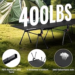 - Anbte Camping Cot with Adjustable Heights – Ultimate Comfort for Outdoor AdventuresThe Anbte backpacking cot is designed to offer a superior outdoor sleeping experience. Whether you're camping, hiking, or enjoying a day at the beach, this cot combines comfort, durability, and convenience to make your outdoor experience even better.With a newly designed leverage locking mechanism, setting up this cot is a breeze. In just a few minutes, you can have it fully assembled and ready for use, without the hassle of complicated installation. The sturdy frame ensures lasting stability, while the lightweight design makes it easy to transport and store.2 Adjustable Heights for Maximum Comfort: The cot features two height options with extendable legs. At 15.75” (40cm), the higher setting is perfect for use on grass, muddy, or damp ground and can double as a bench for seating. The 5.9” (15cm) lower setting is ideal for use as a tent cot or on solid ground, providing extra protection from rough, or wet surfaces, ensuring you sleep comfortably no matter the environment.With a 400lbs (180kg) weight capacity, this camping cot offers excellent durability, suitable for a variety of users. The aluminum alloy frame are strong and stable, designed to withstand outdoor conditions while providing a solid, comfortable rest.Portable and Easy to Carry: Weighing just 4.5kg, this tent cots for camping folds down into a compact size for easy storage and transport. It comes with a convenient carrying bag, making it the perfect companion for any camping trip or outdoor adventure. Whether you're trekking through the mountains or enjoying a weekend getaway, this cot is ready to go wherever you are.