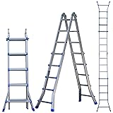 Enhanced Stability with Flared Legs: This telescoping ladder features flared, trumpet-style legs with wide anti-slip feet to provide a broader contact area and improved balance. The sturdy aluminum frame offers high rigidity with minimal flex, while the wide base enhances overall stability. No assembly required—ready to use right out of the box Multi-Position Design for Versatile Tasks: Designed for flexibility, this collapsible ladder easily converts into an A-frame ladder, extension ladder, staircase configuration, or scaffold-style setup. It supports a wide range of indoor and outdoor tasks such as changing light fixtures, accessing attics, home maintenance, roof work, and RV entry Durable Aluminum Construction: Crafted from high-strength aluminum alloy, this A-frame ladder is built for long-term use. The solid frame resists bending during regular operation, while anti-slip base pads help improve footing on different surfaces. Designed to support up to 330 lbs, it delivers reliable performance for everyday household and outdoor projects Secure Locking for Confident Use: Each rung is equipped with a dependable locking mechanism to help maintain ladder position during use and reduce unintended movement. Locks engage smoothly and release easily when adjustments are needed, providing a user-friendly experience for both setup and repositioning during various tasks Space-Saving and Easy to Store: This folding step ladder collapses compactly for convenient storage in closets, garages, sheds, or RVs. Its wear-resistant and weather-resistant design makes it suitable for occasional outdoor storage, while the lightweight structure allows for easy transport between job sites or around the home