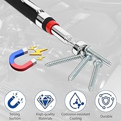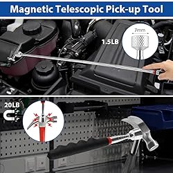 【6 Pack Pickup Tool Set】 This set includes six magnetic pick up tool ranging from 1.5lb to 20lb. The tools offer extension of different lengths: 1.5lb tool (telescopic range: 5-24.61 in), 3.5lb tool (telescopic range: 5-25.20 in), 10lb tool (telescopic range: 6.69-24.41 in), 15lb tool (telescopic range: 7.09-30.71 in), 20lb tool (telescopic range: 7.09-30.71 in), and round mirror (telescopic range: 6.89-19.69 in). 【Flexible and Extendable Design】The pickup tool is made of lightweight stainless steel and can be freely extended, suitable for narrow spaces, high places or hard-to-reach places on the ground. It can easily pick up metal objects such as screws, nuts, keys, tools, etc. The round inspection mirror can be rotated 360-degree adjustable, which allows you to easily and accurately check every angle. 【Super Strong Magnetic Force】The picking tool is made of high-quality stainless steel, which is corrosion-resistant, not easy to deform and has a long service life. Equipped with a strong magnet, our tool can easily retrieve metal objects from hard-to-reach places.This telescoping magnet is perfect for rescuing iron parts from behind the worktable or picking up screws without bending over. 【Comfortable and Convenient 】Humanized design, non-slip padded handle makes this tool magnet very comfortable to hold. Portable size, no burden to carry, easily fits into your magnetic tool bag. Ideal tool for all locksmiths, auto mechanics, fitters, and installers. 【Multifunctional Use】This magnetic telescopic pickup tool is ideal for finding metal nuts, bolts, screws, and other metal parts. It's a reliable companion for car maintenance and home repairs.