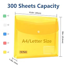 【10 Pack, 5 Colors】: Binditek Plastic Expanding File Folders have 5 colors, total 10 packs, allowing you to easily categorize and identify different files. Perfect for letter size, A4, A5, or smaller size papers. Size: 12.6in x 10in 【Expandable Design for Large-Capacity】: This Plastic Envelopes folder features an expandable side panel, enabling it to hold a substantial number of files. It can hold up to 300 sheets of paper, meeting diverse storage needs 【Secure Snap Closure】: This Expandable File Folder features a reliable snap closure design to keep documents securely stored, prevent spillage, and facilitate easy transport, ensuring peace of mind during transit or storage 【Transparent & Label Pocket】: The transparent front panel allows you to quickly view the contents inside without opening it; dedicated label pockets accommodate custom labels for easy filing and organization 【Multi-Purpose】: This File Folder is not only ideal for organizing documents at home, in the office, or at school, but also perfectly accommodates letters, receipts, certificates, photos, art supplies, stationery, or cosmetics. Suitable for everyone
