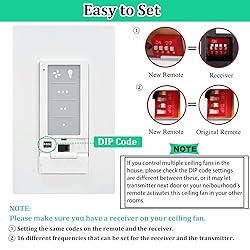 Universal Ceiling Fan Remote Replacement --- This ceiling fan light switch Compatible with most ceiling fans. Replacement of Hunter Westinghouse, Hampton Bay and Harbor Breeze FAN-53T, FAN-35T, UC7078T, Fan-HD, CHQ7078T L3H2010FANHD, L3HFAN35T, L3HFAN35T1, FAN-HD5, FAN-11T, KUJCE9103. 3 Speed Remote & Light Dimmer Switch --- Fan Speed and light dimmer can be individually controlled on a fan and light switch combo. Easily change the ceiling fan from low, medium or high fan speeds to maintain your ideal airflow. You can set the desired brightness from 10% -100% to enjoy the appropriate ambience on different occasions when using the ceiling fan dimmer switch. DIP Codes Setting --- Look inside the old remote with the battery cover off. There is a series of "DIP" switches(4). Use a pen, slide the switches in the new remote to match the same pattern as the old remote. As long as the fan has the receiver (must have same DIP switches too). If you have multiple ceiling fans in your home, please make sure that the DIP code settings are different between them. IT IS ONLY A TRANSMITTER --- This package does not include a RECEIVER. Note: Reverse cannot be changed with remote. But it is suitable for ceiling fans with reverse function. Light dimmer compatible with incandescent light bulbs and some dimmable LED lamps. Most LED/CFL lights are non-dimmable, and the remote only control ON/OFF function in this case. Easy Installation --- Requires neutral wire and separate load wires for fan & light- please confirm that the wiring in your home is compatible before purchasing the wall switch (older homes may not have neutral wires). No Hub required. No canopy module required. Max ceiling fan load of 1 A (3 speeds), a max light load of 180W dimmable LED/CFL. Please Note --- If you have PULL CHAINS SWITCH, before using the remote control, use the PULL CHAINS SWITCH or WALL SWITCH to turn the wind speed to maximum and turn the fan light on. Only in this way can the PULL CHAINS SWITCH and wireless remote control be used together.