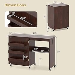 - Description: Enhance the efficiency of your sewing space with this foldable sewing table! A concealed power center of the craft table with charging ports keeps devices charged and the tabletop organized. This versatile sewing table offers ample storage options with a spacious tabletop, 3 storage bins and an open shelf. The foldable design allows for easy conversion between sewing, computer and side table use, saving space when not in use. Mobile convenience is provided by 5 universal wheels, while practical functionality includes a secure latch, magnetic catch and anti-collision pads for safe and easy access to supplies. Features: Make charging multiple electronics effortless with the built-in charging station Enjoy a large work area on the spacious tabletop Keep sewing tools organized with 3 storage trays and an open shelf Save space with the foldable design that meets various needs Versatile use as a sewing machine table, computer desk or side table Ensure stability with 5 smooth rolling casters, including 3 with brakes Secure the extended tabletop with a spring latch Prevent slams with user-friendly anti-collision pads Assembly is required Specification: Color: Brown/Natural/White & Natural/White Material: Engineered Wood, Metal Overall Dimensions: 45.5” x 16” x 31” (L x W x H) Folded Dimensions: 23” x 16” x 31” (L x W x H) Dimensions of Tray: 14.5” x 4.5” x 2” (W x D x H) Dimensions of Open Shelf: 21” x 8.5” x 16” (L x W x H) Power Cord Length: 4.8 ft AC Outlet: 125V/12A USB + Type-C: 5V/2.4A Weight Capacity of Fixed Tabletop: 45 lbs Weight Capacity of Folding Part: 45 lbs Weight Capacity of Shelf: 22 lbs Net Weight: 43 lbs Package Includes: 1 x Folding Sewing Table with Power Strip 1 x User Manual