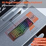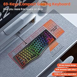 Compact and Comfortable: 69-Key ergonomic keyboard follows ergonomic split layout design, saving space and providing comfort for users. Detachable Cable: Wired design provides a stable, no-lag connection. Easy to carry for travel and storage, enhancing convenience and portability. Engraved Keycaps: Clear, sturdy, and smooth keycaps for long-lasting use and a comfortable typing experience, maximizing hand comfort for long hours of work. Vibrant RGB Backlighting: 18 vivid backlight modes easily change illuminating effects, to illuminate your work area and create a stylish gaming ambience. Versatile Application Silent Keys: Excellent for office, home, and shared spaces, ensuring quiet typing experience without disturbing others.