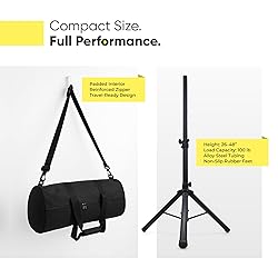 - Take your sound anywhere with this speakers stands pair designed for maximum portability without sacrificing stability. Each speaker stand adjusts from 26" to 48", making them ideal for smaller venues, practice spaces, and travel setups. Crafted from rugged steel, these heavy duty speaker stands deliver the same durability as larger models while maintaining a compact, easy-to-carry size. The non-slip feet and reinforced joints keep your gear steady on any stage or floor. Perfect for DJs, musicians, and presenters, this set functions as reliable PA speaker stands for events, conferences, or home use. The included padded carry case makes storage and transport simple, keeping your stands protected on the go. Compact, strong, and adjustable — this stand set offers professional support in a space-saving design, ensuring your speakers are always positioned for the best possible sound.