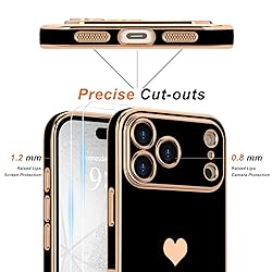 Teageo for iPhone 17 Pro Case with Screen Protector [2 Pack] Girl Women Cute Girly Love-Heart Luxury Gold Soft Cover Camera Protection Shockproof Phone Case for iPhone 17 Pro, Black