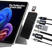 Designed for Surface Pro 12: Our Surface pro 12 hub specifically developed for Surface Pro 12 inch (2025)! This dedicated 8-in-1 Surface Pro 12 inch docking station expertly transforms dual USB-C ports into a comprehensive workstation. It features a 4K@30Hz HDMI port, a Thunderbolt 4 port (40Gbps Data, 4K@60Hz Display, 100W PD Charging), 2*5Gbps USB 3.0 ports, 100M RJ45 Ethernet, 480Mbps SD/TF card readers and a 3.5mm audio jack. Note: Please remove the Surface Pro 12 protective case when using for better connection Crystal-Clear 4K Triple Display Productivity: The HDMI port supports a resolution of 4K@30Hz while the thunderbolt 4 port supports 4K@60Hz. Connect to both simultaneously to enjoy crystal-clear streaming or mirroring across 2 displays. You can connect your Surface Pro 12 to TV, monitor or projector etc, transmitting high-quality images, any switch between office and entertainment. High-Speed, High-Def: A multi-function Thunderbolt 4 USB-C port supports huge charging power up to 100W, data transfer up to an astounding 40 Gb/s, and media display at resolutions up to 4K 60Hz. 2x USB 3.0 ports up to 5Gbps transfer, perfect for your keyboard and wireless device. Additionally, the Surface Pro 12 hub offers an additional 100 Mbps speed RJ45 Ethernet port for faster movie downloads and faster file transfers SD/Micro SD Card Slots&3.5mm Audio Output: The SD and microSD card slots gives you the flexibility and convenience of accessing multiple types of memory card.With support for reading and writing in 480Mbps speed, supporting cards up to 2TB—perfect for photographers and creators. The built-in 3.5mm audio port delivers high-quality sound, perfect for wired headphones, speakers, or microphones during calls, gaming, or media playback. 100W High-Speed PD Charging & Perfect Combination: The Surface pro 12 usb c adapter keep your Surface Pro 12 powered all day with 100W USB-C Power Delivery pass-through charging—enough to run your device at full performance while charging quickly, even under heavy use. The dedicated Thunderbolt 4 port ensures efficient and stable power and data delivery. Special bevel-side and compact design of this docking station perfectly match your Surface pro 12 inch(2025). Compatibility: Only Fit for Surface Pro 12 Inch 2025 new released, Not applicable to any other surface models, Not for Surface Pro 13 Inch
