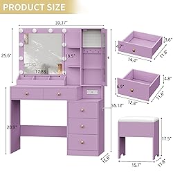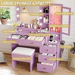 【Glass Cabinet with RGB Ambient Light】The cabinet with glass door is equipped with RGB ambient light inside, which can be controlled by mobile app or button. There are more than 60,000 static light colors, multiple dynamic light modes, music mode, microphone mode and timing function. The music mode allows the LED lights to flash to the rhythm of music. Bring you a great visual feast 【3 Lighting Modes & Brightness Adjustable】The white vanity is equipped with a big mirror. Surrounding the mirror, there are 10 Hollywood bulbs, providing 3 different light modes: warm yellow, natural light and bright white, the brightness is adjustable which can match your different makeup needs, perfect for home makeup, salon, and live broadcast. So you can experience the star-like makeup treatment 【Powerful Storage Capacity】The size of the makeup vanity is 39.37×15.6×55.12 inch/ 100×39.5×140 cm(L×W×H) and weighs 101 lbs/ 41.8 kg. The vanity desk with mirror and lights is combined by SIX parts: 2+3 drawers, glass cabinet with ring storage slots & jewelry hooks, 2 open storage shelves, 3 makeup trays, a wide desktop and a cushioned storage stool. It can help you to classify and store your items, so that you will have a tidy and clean room 【Sturdy Construction & Durable Material】Built from durable P2 engineered wood, no strong odor, anti-scratching and easy clean. The thickened 1'' tabletop with a max load of 50 lbs. The vanity mirror with lights desk is built to withstand daily use and provide long-lasting storage. Designed with the customer in mind, this table combines functionality and aesthetics 【Convenient Charging Station & Hair Dryer Rack】The small vanity desk is equipped with a built-in charging station, including 2 AC outlets and 2 USB ports, through which you can charge and use electronic devices at the same time. In addition, our makeup vanity desk provides you with a hair dryer rack to keep your hair dryer and hair curler within arm’s reach