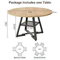 IDEAL for FAMILIES of 6: (Package Includes one Table) The 42-inch round dining table offers generous space for 4 to 6 people, providing it a space for kitchens and dining rooms. Whether for intimate family meals or lively social gatherings, it is the centerpiece for family gatherings. EXTRA LARGE STORAGE SPACE: A Thoughtfully designed storage shelf is for organizing tableware and kitchen essentials, keeping them easily within reach. It helps maintain a clean, clutter tabletop while providing convenient access to everything you need. Round dining table maximizes the usable area of ​​the dining table, a 51-inch round dining table for 6, ideal for family meals and gatherings. STRONG & Long-lasting BUILD: The sturdy cross-shaped base, reinforced 25mm metal legs, carbon steel frame ensure excellent stability and load-bearing strength. The thickened MDF tabletop is heat-resistant, scratch-resistant, and waterproof. Its sleek design, clean lines, and textured finish add a modern, minimalist touch that complements any home décor style. INDUSTRIAL STYLE DESIGN: Add rustic charm to your home with its wood tabletop and cross base, creating a warm and inviting dining space. The blend of traditional farmhouse and modern design, paired with a wood grain finish, makes it a versatile fit for various home styles. Ideal for kitchens or dining rooms, it saves space while enhancing the room’s aesthetic. SPACE SAVING DESIGN: The cross-shaped base provides ample space and legroom for diners, while allowing stools to be easily tucked underneath. Its compact design makes this an ideal choice for kitchen&dining room, and apartments. EASY ASSEMBLY: Includes clear instructions, numbered parts, and pre-drilled holes for quick and accurate setup. We're dedicated to excellent service-to email us with any questions, and we'll respond within 24 hours.
