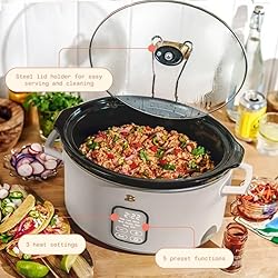1. LARGE 6-QUART CAPACITY Perfect size for family meals, batch cooking, and weekly meal prep, fitting roasts, soups, stews, or pasta dishes with plenty of room for generous servings. 2. PROGRAMMABLE DIGITAL CONTROLS Features an easy-touch control panel with multiple time options, giving you precise cooking results whether you prefer low, high, or extended warm cycles. 3. AUTO KEEP WARM FUNCTION Automatically switches to Warm mode after cooking, ensuring food stays at the ideal serving temperature without overcooking or drying out. 4. HINGED LID FOR CLEANER SERVING Convenient hinged lid prevents messy drips on your countertop and makes stirring, serving, and tasting easier without searching for a place to set the lid. 5. REMOVABLE NONSTICK POT Includes a durable nonstick cooking pot that lifts out for simple cleaning and effortless serving; fully dishwasher safe for added convenience. 6. EVEN, CONSISTENT HEATING Designed to deliver uniform heat distribution throughout the pot, helping your dishes cook thoroughly and evenly every time. 7. COUNTERTOP-FRIENDLY DESIGN Compact footprint saves kitchen space while still offering a full-size 6-quart capacity, blending practicality with a modern, sleek aesthetic. 8. IDEAL FOR DAILY COOKING Perfect for busy households seeking quick, hands-off meals—ideal for chili, casseroles, shredded meats, beans, oatmeal, dips, and weekday dinners.