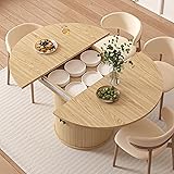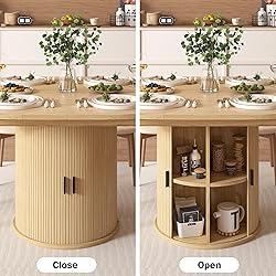 Vipbear Extendable Dining Table 43-59" for 4-6 People, Solid Wood Top with Fluted Slide Door & 8-Compartment Storage, Space Saving Round Dining Room Kitchen Dinner Tables Furniture with Pedestal Base