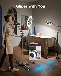 【Glide Anywhere, Craft Everywhere】Imagine moving freely across your craft room with the LUXSURE ring light with stand and phone holder on smooth, rolling caster wheels. From quilting to sculpting or live-streaming your latest project, glide seamlessly between workstations. When you find the perfect spot, lock the wheels and let your hands focus on creating delicate details, while this standing ring light stays perfectly in place, keeping every corner of your workspace beautifully illuminated for photography or recording. 【Light Exactly Where You Need It】Adjust your light effortlessly with a flexible arm and 360° swivel. The LUXSURE overhead phone mount with ring light or ring light tripod for iPhone lets you shine bright where it matters most—highlighting stitches, brushstrokes, or intricate jewelry details. Once positioned, it stays steady, giving you freedom to work without distractions. Every corner, angle, and texture is beautifully lit for phone stand for recording or live-streaming projects. 【See Every Stitch and Stroke Clearly】Soft, even lighting from the LUXSURE tripod for iPhone with light ensures every detail of your craft is visible without harsh shadows or glare. Whether painting miniatures, stitching embroidery, sculpting clay, or assembling jewelry, this ring light with wheels makes colors pop and textures stand out. Work for hours comfortably, knowing your hands, your project, and your vision are perfectly lit. Every creation shines true to life, making every crafting moment enjoyable and precise. 【Perfect Light for Every Mood and Project】Every craft has unique lighting needs, and LUXSURE’s ring light with stand gives you total control. With 10 brightness levels and 3 color temperatures, create warm, cozy light for knitting or candle-making, or bright, neutral light for calligraphy, painting, or detailed jewelry work. Adjust instantly to suit your project, mood, or time of day. Your workspace is always inviting and perfectly lit, helping your hands focus on creating while your imagination flows freely with this overhead camera mount with ring light. 【Make Your Work Shine Online and Off】Show off your creations in the best light with LUXSURE phone holder for video recording or ring light tripod for iPhone. Perfect for photography, live-streaming, or tutorials, it highlights every color, texture, and fine detail. From quilting to miniature painting, your projects appear crisp, vibrant, and polished on camera. The ring light with stand and phone holder ensures your creations always look their absolute best, helping you share your passion confidently and grow your audience.