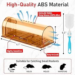 100% HUMANE: Our humane mouse traps indoor for home allow you to catch mice without stress or cruelty. These live mouse traps are designed with extra air holes and plenty of space to ensure a comfortable environment for the trapped mice while providing an ethical solution.These no kill mouse traps cause no harm to the mice. No Touch Release Mechanism: Our innovative design features a no-touch release mechanism, allowing you to easily release trapped mice without touching them. With LULUCATCH live catch mouse traps, you can confidently handle releases without fear, ensuring a smooth transition back into the wild. Pet Safe Pest Control: Our mouse traps indoor for home are very safe around pets and your family. Without any glue, poison or electricity, these rat traps are safe to use around cats, dogs, hamsters, and other animals, providing for a humane indoor and outdoor rodent control. Reusable and Easy to Clean: Made from firm ABS plastic, these mouse trap tubes are long-lasting and easy to clean and reuse. Simply rinse with hot water and soap after each use, and you are ready for your next catch while keeping your home rodent free. To make cleaning even easier, we've included a CLEANING BRUSH to keep the trap in pristine condition. A practical choice for long-term use. Sturdy & Sensitive Design: Our humane rat traps are sturdy and lightweight, made from high quality ABS material that's thick enough that no rat can chew through it. The trigger mechanism is very sensitive and triggers the gate instantly. Our catch and release mouse traps is also large enough to ensure that even the fattest mouse can't escape.