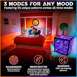 Infinite Galaxy of Lights: HyperCube brings a spectacular display of mesmerizing light show to your space. The infinity mirror art piece transports you to another dimension with its hypnotic light explosion making it a must-have for gamers in their gaming rooms, perfect décor for bedrooms, dining or living rooms, and any space that needs a revamp. Hyper-Chromatic Technology: Developed by electronics engineers, the HyperCube's custom-written code activates LEDs with a wide variety of animations and infinitely shifting & adjustable color palettes. Fully customizable with up to 16 million color combinations, set the right ambience by choosing the best pattern & colors for every mood. Hyperspace Lighting App: Customize the brightness, speed, patterns, and even set a nightlight timer for sleeping hours. Access over 90 patterns in three different modes: Kaleidoscopic for a futuristic maximum chromatic brilliance, Meditative for softer breathing-like patterns, and Sound Reactive for immersive animated light show. Sync Light to the Music: With next-gen sound reactivity, the lights dance and strobe to the beat of the music. It dynamically adapts colors, patterns, motions & effects to the frequencies of your music. Highs, mids & lows are analyzed in real time, creating an ultra-responsive personal lightshow ideal for setting the party atmosphere. Great gift idea and perfect as desktop & furniture decoration.