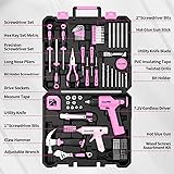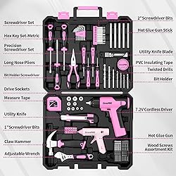 188-Piece Pink Tool Set:This home tool kit includes almost every basic hand tools you need for work and DIY projects around the house. Includes power drill cordless (with charging cable), wrench, claw hammer, tape measure, pliers, precision screwdrivers, utility knife, and much more.Tool kits perfect for home decoration, furniture assembly, appliance repair, drilling, DIY woodworking projects Pink Cordless Drill Set: The compact design of the mini drill makes it easy to operate and use in small spaces; this hand drill has a 1/4" magnetic suction cup for quick drill bit changes. Press the switch to adjust the speed of the drill, with a maximum no-load speed of 800r/min. The forward/reverse switch allows you to tighten or replace/remove the drill bit as needed. The built-in LED light provides extra safety when working in dark areas. Comes with a Type-C 1.5A charging cable, you can connect it to a universal charger or USB Output (5Vd.c) to charge Diamond Portable Plastic Tool Box: The embedded groove design allows your electric drill cordless and hand tool set to be neatly embedded in this storage case, so that your tools will not fall easily. The buckle design of the tool boxes will also better lock your tools. Conveniently carry it with you when you work at home or outdoors Long service life:Tools are forged from alloy steel, durable and not easily damaged. All tools have added corrosions protection process on the surface to extended tools lifetime. These hand electric tools are rust-proof so you don't have to worry about leaving your tools outdoors Ideal Gift:The pink tool kit is perfect as a gift for your home use.Best Gift for Mom, Girlfriend for Christmas, Birthday, Anniversary, Valentine's Day, etc