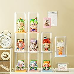 Acrylic SIZE WILL FIT YOUR MINI POP FIGURES?: Our small display box is suitable for small collectibles with a max height of less than 5 inches and a max width of less than 3 inches. Please measure your mini figures before purchasing. CRYSTAL-CLEAR VISIBILITY & ALL-AROUND PROTECTION: Our small display boxes made from high-quality transparent acrylic and plastic for 360° display viewing, enjoy dustproof & water-resistant protection while admiring your figures without opening the acrylic display box. You can freely mix according to your preferences, showcasing your mini pop figures to the fullest. NO ASSEMBLY REQUIRED & STABLE STACKABLE DESIGN: These small display cases are single-piece construction (integrated box), no assembly required, take off the top cover and place your small collectibles on the stand, simply and easy. These clear display boxes are sturdy and durable, with a top groove design that can be stacked and placed. TILT IS NOT EASY TO FALL: Stackable blind boxes equipped with traceless tape, these can be attached to the feet of your mini pop figures, making it stand steadily and not fall when tilted. WIDE APPLICATIONS: These small display boxes are suitable for desk, office table, dresser, bedside table to display and organize mini toys, small collectibles, miniatures, trinkets, and any other knickknacks.