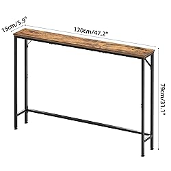 - Helper for small spaces: The console table with a size of 5.9”(D)x47.2”(W) x 231.1” (H) is perfect for placing behind sofa, bedroom, living room, plant room, kitchen, study room, conference room, entrance, corridor, and any other space you want to use, perfectly solving the problem of small spaces being left unused Minimalist Console Table: This narrow entryway table can transform into a butler for keys and magazines at the entrance, a green plant display table next to the window, a storage assistant in the bedroom, or the best sofa table next to the Couch "Modern industrial style fusion: The black metal frame is paired with vintage brown wooden panels, perfectly combining modern and rural styles, suitable for families of all styles. Using the console table may make your study or bedroom more charming Stuctural Stability: The frame of the small entryway table adopts the square connection design, making the table more stand wear and tear. In addition, it is equipped with adjustable footpads to ensure the level of the small behind couch table, but also to provide security for the floor Easy installation: This Narrow Console Table comes with a complete assembly kit and clear and easy to understand installation instructions. You can easily assemble it according to the instructions and say goodbye to the trouble of assembly