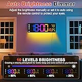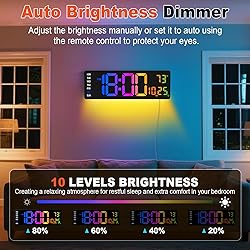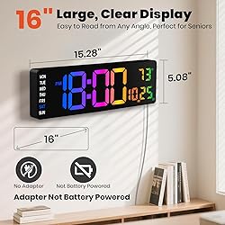 【16-Inch Clear Large Display】Measuring 15.28" wide by 5.08" heigh,this large digital wall clock is easy to read at a glance—perfect for seniors or anyone with visual challenges. The clear, user-friendly interface shows the month, date, day of the week, and time in either 12- or 24-hour format, along with indoor temperature in °C/°F. With two alarm settings for everyday convenience, it helps you keep track of time and daily details effortlessly. 【Dynamic RGB Colors & Ambient Night Lights】Our Pytha Sight large LED digital wall clock features dynamic RGB lighting, with 9 ambient color options at the base of digital clock wall. The soft glow creates a calming atmosphere, adding comfort to your bedroom while helping you unwind for a restful night's sleep. 【Truly Desktop and Wall-Compatible Design】Enjoy complete flexibility,this digital clock for classroom can be easily mounted on the wall or placed on your desk, nightstand, or shelf. Its sleek, modern design adds both style and function to any space. 【10-Level Auto-Dimming】The Pytha Sight wall clock with temperature features a large display with 10 adjustable brightness levels, which can be easily controlled using the remote. It also includes a built-in light sensor for automatic dimming, seamlessly adjusting brightness to match ambient lighting conditions—ensuring clear visibility day or night while protecting your eyes. 【Fitness and Kitchen Helper】When cooking or barbecuing for friends and family, use the Count Up timer to keep track of your cooking time. Our digital wall clock large display with a countdown timer is also perfect for workouts and productivity sessions—ideal for timing intervals at the gym or staying focused on tasks. 【Have to Plug In】Our big digital wall clock with date is not battery-operated. It must be powered with a 5V power adapter (not included) and the included USB cable. Two Memory Batteries (Not Included) can be installed to ensure your settings are saved even if the clock is unplugged. 【 Top Gift Pick】Our digital wall clock with temperature and date display makes an excellent gift, adding a stylish touch to any indoor space—whether it’s the living room, bedroom, office, garage, game room, kitchen, gym, farmhouse, warehouse, classroom, or store. It’s also a thoughtful present for birthdays, housewarmings, holidays, friends, family, loved ones, and the elderly.