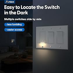 Auto Dusk-to-Dawn Night Light: Integrated 3000K LED night light automatically provides soft, glare-free illumination in dark rooms, helping guide movement at night without turning on overhead lights. Ideal for hallways, bedrooms, bathrooms, and stair areas in family homes 2-in-1 Switch & Night Light Design: Combines a standard wall switch with a night light in one unit, reducing the need for plug-in night lights and freeing up outlets while keeping walls clean and organized for a modern residential interior Soft, Glare-Free LED Guide Light: Designed to emit a gentle, eye-friendly glow that improves nighttime visibility without disturbing sleep, making it suitable for kids’ rooms, guest rooms, and shared spaces where subtle lighting is preferred Easy Installation & Universal Fit: Fits standard single-pole wall boxes and replaces your existing Decora-style switch. No neutral wire required, and simple wiring makes DIY installation quick and hassle-free. (LED light facing upward or downward.) Energy Efficient & UL Listed: Amico's light switches meet rigorous UL standards and are suitable for residential, commercial, and office use—ideal for bedrooms, hallways, bathrooms, stairs, and kids' rooms