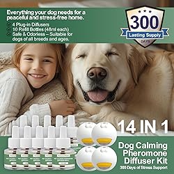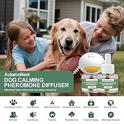 14-in-1 Super Large Capacity & Long-Lasting Use: Includes 4 diffuser heads + 10 refills (48ml each). Each refill lasts up to 30 days, providing up to 300 days of continuous use. Convenient year-round solution for multi-pet households New Advanced Pheromone Formula: Mimics natural mother dog pheromones to relieve anxiety, reduce barking, stop destructive chewing, and ease separation stress. Safe, drug-free, and effective for puppies, adult dogs, and senior dogs Upgraded Night Light Design: AutumnNest calming diffuser features a built-in soft night light that creates a gentle, relaxing glow while steadily releasing its soothing fragrance. Ideal for providing dogs with a peaceful and comfortable atmosphere, especially at night Covers Up to 700 sq. ft.: Dog calming pheromone diffuser kit spreads soothing signals effectively in large rooms, apartments, and multi-dog households. Place in areas where dogs spend the most time for best results Easy & Safe to Use: Plug into any standard outlet, and the diffuser with night light starts working immediately. Odorless, non-toxic, and safe for dogs and humans. Continuous, hassle-free calming support without pills, chews, or training