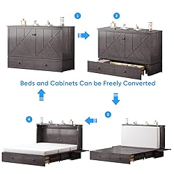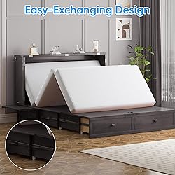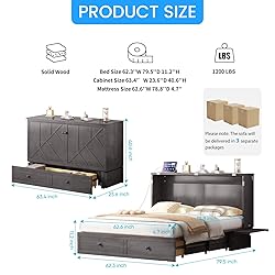 [Multifunctional Design]: The PUREMIND Murphy Bed is elegantly housed in a stylish cabinet featuring a spacious drawer and a built-in charging station. It effortlessly doubles as a TV stand or additional storage, making it a practical and space-saving solution for modern living. [Premium Solid Wood Construction]: Crafted from high-quality solid wood, this queen-size Murphy bed ensures lasting durability. The frame is reinforced with metal connectors for added strength and features fixed universal wheels, providing both stability and seamless mobility when needed. [Integrated Charging Station]: Stay connected with convenience! The bed comes equipped with 2 standard AC outlets and 2 USB ports, allowing you to charge your devices effortlessly without leaving your bed. For added comfort, it includes a 4.7-inch thick folding high-elasticity foam mattress. [Easy Assembly]: The bed frame arrives in two separately shipped boxes (may arrive on different days). With clearly numbered parts and detailed instructions, two adults can easily complete assembly within 2-3 hours. Should any questions arise, our support team is just a message away! [Space-Saving Solution]: Perfect for compact living spaces, this Murphy bed optimizes your floor plan. When open, it measures 79.5"L x 63.4"W x 40.6"H, providing a comfortable sleeping area without sacrificing style or functionality.