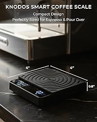 • Brew coffee like a professional with the KNODOS Smart Coffee Scale, designed to make espresso and pour-over brewing easier, faster, and more precise. Built with premium features in a compact body, this scale is the ultimate tool for both beginners and advanced coffee lovers. With 4 intelligent brewing modes, you can tailor the scale to your preferred method. The Basic mode gives you classic scale use for everyday needs. The Espresso mode is truly smart – place your cup, start your machine, and the scale automatically begins timing and weighing without pressing a single button. For pour-over enthusiasts, choose between the Ratio mode, which helps you monitor your water-to-coffee balance, or the Weight mode, which focuses purely on accurate gram tracking. Compact and stylish at just 10x10x2cm (4x4x0.8in), it fits neatly under any espresso machine and works equally well for drip brewing. One scale, two worlds – no need for separate tools. The premium silicone heat-resistant pad protects the surface and doubles as a stable holder for your portafilter, making prep easier and cleaner. Enjoy a premium brewing experience with features like auto tare, auto sleep, fast one-touch operation, and an easy-to-read backlit display. The rechargeable USB-C Li-ion battery lasts up to 90 days in standby, ensuring your scale is always ready when you are. Whether you’re dialing in espresso shots or brewing delicate pour-over, the KNODOS Smart Coffee Scale brings precision, simplicity, and style to your coffee ritual.