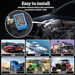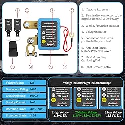 [Powerful Disconnection with High Capacity]: This battery disconnect switch is rated at 240A current and 12V, allowing the kill switch for car to handle up to 1000A instant current while consuming just 3mA on standby. The remote battery disconnect switch features a power-off threshold of 11.8V±0.2V, making it an ideal car battery disconnect switch for reliable performance [Innovative Magnetic Latching for Energy Efficiency]: Our remote battery disconnect switch utilizes cutting-edge technology with a magnetic latching mechanism. This car kill switch anti theft employs magnetic principles to control circuit disconnection, ensuring the battery kill switch for car is both reliable and energy-efficient with an ultra-low standby current of 3mA [Intelligent LED Voltage Display for Real-Time Monitoring]: The LED voltage display on our battery kill switch 12v provides easy monitoring of your vehicle's battery voltage. If the voltage drops below 11.8V/23V, this car battery kill switch will automatically cut off power after 120 seconds to prevent drain. When voltage exceeds 13.2V/25V, the remote kill switch for car disables remote functions to avoid accidental shutoffs while driving, enhancing safety [Effortless Installation and Safe Operation]: Designed for simple setup, this 12v remote control switch connects to the negative terminal for stable operation as a killswitch. Safety is key with our kill switch—always turn off power before installing this battery kill switch to prevent electrical issues, suitable for auto, truck, RV, or boat applications [Battery Protection and Lifespan Extension]: Using this wireless battery kill switch for car helps prevent drain from long-term parking, aging electronics, line wear, or forgotten lights. As a corta corriente para auto or kill switch for boat, this remote battery disconnect safeguards against unnecessary consumption, prolonging battery life and boosting vehicle reliability