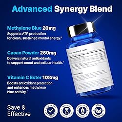 INSTANT CLARITY & MENTAL SHARPNESS – Elevate your day with our methylene blue USP grade capsules crafted for laser focus and cognitive clarity. The perfect memory supplement for brain support—no fog, no crash, just pure clarity. STEADY, CLEAN ENERGY – NO JITTERS, NO CRASH – Unlike caffeine, our methylene blue supplement delivers all-day stamina without the spike. Feel energized, not wired—with smooth, sustainable power in every blue capsule. UNLOCK LASER-FOCUS ANYTIME, ANYWHERE – Whether you're working, studying, or multitasking, blue methylene blue capsules help you stay dialed in with unmatched mental stamina. ADD TO CART now. PURE, PHARMACEUTICAL-GRADE FORMULA – Made with 99.9% USP grade methylene blue for humans, our formula is third-party tested, toxin-free, and crafted without fillers, dyes, or synthetics. Clean. Effective. Reliable. DESIGNED FOR BIOHACKERS, BUSY BRAINS & HIGH PERFORMERS – Our sleek, matte-black bottle preserves potency while turning heads. Whether you need methylene blue 1%, methylene blue 2%, or just next-level focus, methylene-blue has never looked this good.