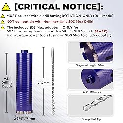 Complete Core Drill Set – Includes the dry core drill bit (OD:2.75 inch), 1 pilot bit, 1 drift key and 3 adapters (5/8"-11 male thread to SDS Max/Plus & 1/2" Hex) for compatibility. (For best results, use included adapters with guiding bit—compatibility with other brands may vary. See the user manual) Precision Design & Instant Positioning - No need pre-drilling guide bit by DaduoRi designed, enabling seamless start-to-finish operation without mode switching. Improved Cutting Diamond Segment – Features a newly cutting segment with higher durability, this 2 3/4 core drill bit with pilot bit effectively drills through low to medium-reinforced concrete. (On 8" thick concrete with 12mm rebar— 8-10 holes per bit.) Compatible Materials: This 2-3/4 in concrete core drill bit drills efficiently through brick, mortar, cinder block, and low to medium-reinforced concrete with rebar, making it suitable for HVAC, plumbing work DaduoRi's coring bits alaways design to simplify drilling tasks for both professionals and DIYers