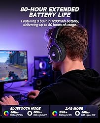 3-IN-1 WIRELESS HEADSET - EKSA E900WT gaming wireless headphones for PC, Switch, Mac, and laptops are your all-in-one solution, supporting 2.4GHz dongle mode, surpassing other gaming headsets in performance. Easily switch to Bluetooth 5.3mode for mobiles, tablets, iPads, and smart devices. ❌Note 1: Both modes are NOT compatible with any Xbox.⚠ Note 2: The microphone is NOT compatible with Switch.🚫Note 3: Bluetooth mode is NOT compatible with PS4/PS5. IMMERSIVE SOUND & GAMING LIGHTING - Experience gaming like never before with our PC wireless headset, equipped with a 50mm dynamic driver for unparalleled 3D stereo sound. this gaming headphones include a futuristic LED light effect by using EKSA Logo , enhancing your gaming experience. Ultra-Low Latency Gaming - Experience unparalleled gaming with our state-of-the-art wireless gaming headset for PS5/PS4/PS3. Equipped with a 2.4GHz USB dongle, it delivers ultra-low latency audio (≤30ms) for a truly immersive adventure. Pressing the mic button for 2 seconds, Effortlessly switch to Bluetooth mode, enjoying swift responsiveness (<48ms). Embrace wireless freedom and precision. Customize your auditory journey for an unrivaled gaming experience. NOISE-CANCELING MICROPHONE - The retractable noise-canceling microphone ensures crystal-clear communication, making the bluetooth headset perfect for multiplayer gaming and streaming.Advanced noise-cancelling tech blocks out background noise, ensuring you hear every crucial step, reload, or voice cue in games like Fortnite, Call of Duty, The Legend of Zelda, and RPGs with precision. giving you full control and clarity in every intense battle.Mute the mic with a single click. LONG BATTERY LIFE - featuring a powerful 1200mAh battery that supports up to 30 hours of gameplay with dynamic LED lighting, or an impressive 80 hours without. Enjoy ultimate convenience with our quick 2.5-hour USB-C charge. Perfect for nonstop gaming.This headset guarantees you're always ready for action. COMFORTABLE EAR CUSHIONS - Indulge in unmatched comfort with our gaming wireless headset for PS4/PS5, engineered with adjustable headbands that distribute pressure evenly for a custom fit. Suitable for gamers of all ages, it provides enduring comfort, even during marathon gaming sessions. The advanced breathable earmuffs offer exceptional noise isolation, the moisture-wicking design keeps you cool and comfortable, even in the heat of intense gameplay.