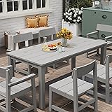 【Upgraded Material for Superior Outdoor Durability】Crafted from sturdy HIPS, this 6-person outdoor dining table offers greater hardness and weather resistance than HDPE. Exceptionally durable in outdoor conditions, HIPS retains its shape in cold or humid climates and resists UV, rain, and wind. 【All-Weather Resilience】Engineered to last, HIPS resists rust, UV, and extreme temperatures without sealing or repainting. Just wipe with water. This low-maintenance, storage-free set suits patios, lawns, gardens, balconies, and poolsides. 【 Patio Table with Umbrella Hole】The patio dining table is designed with an umbrella hole, allowing you to add shade during sunny days. 【Easy to Assemble】This outdoor patio dining table comes with all necessary tools and clear installation instructions. Pre-drilled holes simplify assembly and save your time, enabling quick setup of your dining area, patio decoration, and enjoyment of outdoor dining. 【6-Seater Outdoor dinging Table】Boasting a wood grain design with unique aesthetic appeal, this outdoor table is suitable for both indoor and outdoor use, ideal for dinners and parties. Measuring 71"D32"W29.5"H and with a load capacity of up to 400LBS, it offers ample space for meals, drinks, and table decorations.