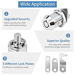 【Check Before Purchase】Please review Figures 5 and 6 to select the appropriate lock size based on your latch distance and door thickness. Ensure both dimensions are compatible. This toolbox lock is designed for a standard 3/4-inch diameter mounting hole. No need for complicated tools! Quick and easy installation. Simply remove the old broken cabinet lock or toolbox lock and replace it with ours in seconds. 【Wide Compatibility】This universal cam lock is a direct replacement lock for many applications. It fits tool box locks, cabinet locks, mailbox locks, and RV storage compartment door locks. An ideal tool box lock replacement or truck toolbox lock replacement.. 【Strong & Durable】Designed with a robust tubular cam lock mechanism and zinc alloy construction, this lock with key provides reliable protection for your valuables. The cylinder lock core offers superior pick resistance and is weatherproof , making it excellent for storage units, outdoor cabinets, RV compartment locks, and truck tool boxes to prevent theft and intrusion. 【Convenient Keyed Alike】Both locks with keys in the package are keyed alike (use the same key), offering great convenience for managing multiple cabinet locks with keys or toolbox locks with keys. The package includes 3 kinds of spare lock plates, 2 keys, and 1 anti-slip hex nut、1 positioning piece、1 locking washer、1 nut with thread-locker. 【Satisfaction Assurance】We stand behind the quality of our product. If you are not completely satisfied with your purchase for any reason, or if you have any questions, please don’t hesitate to reach out to us to ensure your peace of mind.