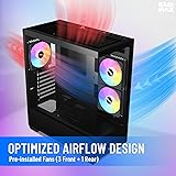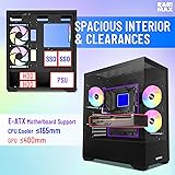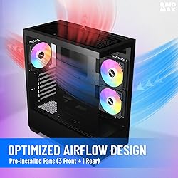 Panoramic View: Corner structure-free tempered glass design offers an unobstructed, panoramic view of your system's components. Cooling Capacity: Supports up to a 360mm radiator for liquid cooling and 400mm graphics cards for high-end gaming setups. Pre-Installed RGB Fans: Comes equipped with 3 ARGB fans for enhanced airflow and customizable RGB lighting. Convenient Access: Hinged tempered glass side panel allows for easy access to the interior for seamless upgrades or maintenance. Spacious Interior: Roomy interior layout provides ample space for cable management and housing multiple storage drives.