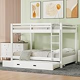MERITLINE Queen Over Queen Bunk Bed with Trundle, Solid Wood Bunk Bed with Ladders and Guardrails for Adults (White)