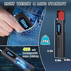 Comprehensive Privacy Protection: Our camera detector provides a wide range of detection functions, which can accurately detect eavesdropping devices, hidden cameras, pinhole cameras, surveillance cameras, infrared cameras, GPS trackers, devices with 2G, 3G, 4G mobile signals, electrical radiation sources, etc., ensuring maximum privacy & security 5 Modes of Professional Spy Detector: This upgraded hidden camera has 5 modes, which are versatile & practical: Detection of radio waves, Detect cameras lens, GPS magnetic field detection, Top emergency light, Anti-theft alarm. It can not only detect hidden devices, but also better protect your safety More Effective Detection of Hidden Cameras: This hidden camera detector has a viewfinder with a red filter. Turning on the infrared detection function and opening the viewfinder can find the reflective bright flashing camera lens faster and more clearly (with the video recording function on the phone, you can find the hidden camera lens more clearly) Multiple Detection Types: This hidden bug and camera detector is equipped with an antenna to expand the detection range and enhance the anti-interference ability. 5 detection signal sensitivities can find the spy signal source more accurately and quickly in a large environment. 3 types of infrared light flashing, red light always on, red light slow flashing, red light fast flashing, can more easily find hidden cameras in the environment 2 Working Modes: Our GPS tracker detector has 2 types of alarms: sound & silent vibration. After turning it on, short press the power button to switch, and you can set the vibration or sound mode according to your needs Lightweight & Portable: This signal detector is small, 3.7 x 0.9 x 0.6in, weighing only 28g, with a lanyard, which can be put into your pocket and hung on your bag, so you can easily carry it with you, ensuring that you can stay alert anywhere to prevent privacy leaks Rechargeable & Ultra-Long Standby: Bug detector has a built-in 400mA rechargeable large-capacity lithium-ion battery, which can be fully charged in just 2 hours, and can be used for a longer time after charging (the length of time depends on the usage mode), completely solving battery life anxiety Your Best Privacy Guard: This latest upgraded detector in 2024 can make you feel safe and assured in your private space, better protect your privacy and security when traveling, and create a more secure living and working environment for you