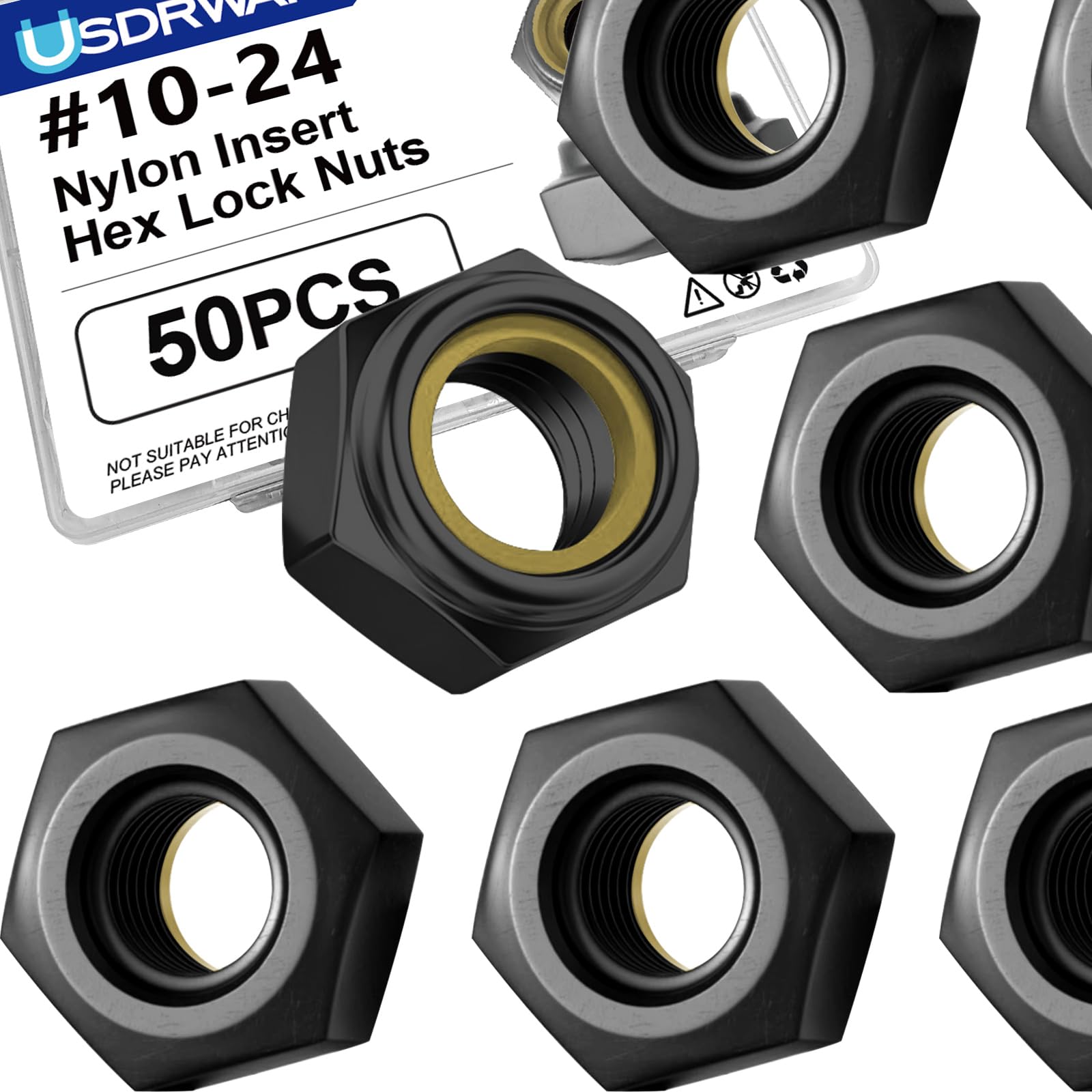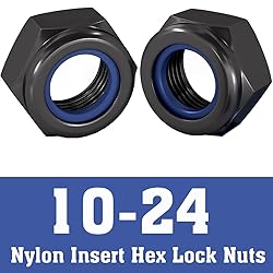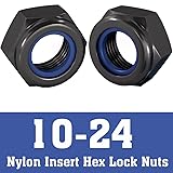 - 10-24 nylon insert lock nuts feature a robust black e-coating finish and are crafted from high-quality 304 stainless steel. The set includes 100 packs of 10-24 hex locknuts, perfect for various assembly and mechanical applications. The 10-24 nylon insert provides excellent vibration resistance and prevents the nut from backing off under load, while the hex design allows for easy installation and removal with standard tools. The black coating adds an extra layer of protection against corrosion and wear, making these nuts suitable for indoor and outdoor use. These 10-24 lock nuts are beneficial in applications where secure fastening is crucial, such as machinery, automotive work, or general construction projects. The 10-24 thread size is a common standard, ensuring compatibility with many bolts and threaded rods. Each nut is precisely manufactured to maintain consistent performance and reliable locking action.