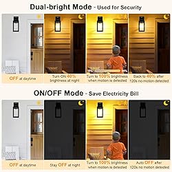 Smart Dual-Sensor for Fully Automatic Security: Experience truly hands-free lighting with this intelligent outdoor motion sensor light. Combining a precision motion sensor and photocell, it intelligently activates at dusk and responds to movement within a wide 120° angle and 25-foot range. Expertly calibrated to distinguish human activity from pets, it delivers reliable protection day and night 3 Customizable Lighting Modes: Choose from 3 smart modes to perfect your ambiance. This versatile dusk to dawn porch light offers a dedicated auto mode, while Dual-Bright maintains 40% light (adjustable 15-50%) and surges to 100% on motion; ON/OFF activates only upon sensing movement; and Manual Override provides 8 hours of constant full brightness for gatherings Weatherproof & Long-Lasting: Engineered for durability, this reliable outdoor porch light is built with robust metal and toughened glass, boasting an IP55 rating to stand up to rain, snow, and extreme temperatures (-20°C to 50°C). Enhanced sealing and anti-rust treatment ensure years of fade-free, dependable performance Modern Compact Design for Wide Application: Elevate your home's exterior with this stylish front porch light. Its 13-inch modern, compact matte-black design with a discreet hook and clear glass shade creates soft upward lighting, perfectly blending functionality with style for porches, garages, patios, and entryways Easy Setup & Worry-Free Support: This pre-assembled porch light fixture allows for quick, tool-free installation with all hardware included. It easily accommodates E26 bulbs up to 60W (bulb not included). Your satisfaction is backed by reliable support—contact LTBLIGHT for assistance with any quality issues