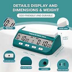 【Multi functional Chess Clock】Feiyasi professional digital chess clock has five modes: Basic, Delay,Bonus, BYO-YOMI, and positive timing. The maximum timer duration is 10 hours and there are five timer modes to provide you with different gaming experiences. Therefore, it is not just a chess clock timer, it can support multiple 2-player games worldwide and is not limited to your gaming style. 【 Simple Setting 】This chess clock adopts simple operation settings to avoid wasting unnecessary time on settings. We also provide detailed instructions and instructional videos on the product details page to give you a more intuitive understanding of how to set up this chess clock timer. Therefore, even if you are a beginner, you can quickly learn how to use it 【Easy to carry chess accessories】 The Feiyasi portable chess clock adopts a lightweight design, making it lightweight and portable. This chess clock can be used both in the tournament room and outdoors. Without using the chess clock, you only need to put it in your bag. 【Volume adjustment and shutdown function】Feiyasi Chess Clock with volume adjustment, including sound/mute function. You can adjust the volume according to your environment or preferences. When not in use, you can turn off the chess clock to save power. 【portability of battery drive】If the battery of the chess clock runs out, only one AA battery needs to be replaced to provide long-lasting power for the chess clock. The portable chess clock is a timer with an extremely long battery life, so you rarely need multiple batteries to ensure that the game will stop.