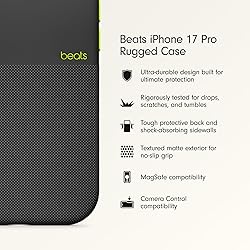 The Beats iPhone 17 Pro Rugged Case with MagSafe & Camera Control is built to for extra protection from drops and scratches. Our rigorous testing included repeated drops, tumbles, scratch tests and a wide array of thermal, chemical and mechanical tests. The case’s ultra-strong, ultra-durable polymer backing is complemented by additional impact-absorbing sidewalls and an enclosed bottom for enhanced device protection, and has undergone thousands of hours of testing. This thick, durable case works seamlessly with Camera Control; a custom-designed conductive layer communicates finger movements. The case’s textured matte exterior provides extra grip and reduces signs of scratches, smudges and fingerprints. Each case size is MagSafe compatible, with built-in magnets that align perfectly with their corresponding iPhone 17 Pro model for an easy attach experience and efficient wireless charging. Each case size is MagSafe compatible, with built-in magnets that align perfectly with their corresponding iPhone 17 Pro model for an easy attach experience and efficient wireless charging.