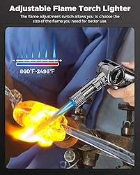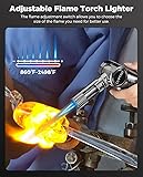 Efficient Instant Ignition & Adjustable Flame: Butane torch lighter, it ignites instantly, adjustable high output flame can enlarge the heating area and improve the heating effect. Temperature range of up to 1300°C/2372°F, our culinary torch can meet all of your use needs. Lightweight and compact design makes it easy to carry and store, adjust and lock the flame with just one hand. Windproof Design For Maximum Safety: Kitchen torch engineered to resist wind, ensuring reliable ignition and consistent performance. Ergonomic design provides comfort to your hand, 90° rotatable fire outlet, you can choose your own angle, providing a better use experience and protects your fingers from being burned safer design. Sturdy Refillable Culinary Torch: Blow Torch Adopted with heat resistant material (Alloy+ABS) , lighter can be refilled after running out of use for long lasting use. Hand torch with safety lock prevents accidental ignition, when the ignition is started, the safety lock in turn functions as a continuous keep firing to set the fire and a wide set base helps to prevent it falling over. Versatile & Portable Lighter Torch: Lightweight and compact design makes it easy to carry and store that you can take it for many outdoor activities like camping and BBQ. Also useful for lighting your caramelizing sugar atop creme brulee, glazing a baked ham, searing a steak, roasting bell peppers, melting cheese and toasting bread crumbs fireplace, candles or cigars, for hobby, arts and crafts projects, jewelry making, welding, for multiple camping applications, dabs, and much more. Versatile & Portable Lighter Torch: Lightweight and compact design makes it easy to carry and store that you can take it for many outdoor activities like camping and BBQ. Also useful for lighting your caramelizing sugar atop creme brulee, glazing a baked ham, searing a steak, roasting bell peppers, melting cheese and toasting bread crumbs fireplace, candles or cigars, for hobby, arts and crafts projects, jewelry making, welding, for multiple camping applications, dabs, and much more.